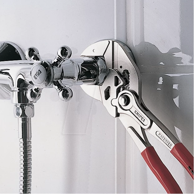 - The Knipex 86 03 Series Pliers Wrench with dipped PVC handles and smooth parallel jaws for cautious installation of plated fittings or sensitive surfaces.