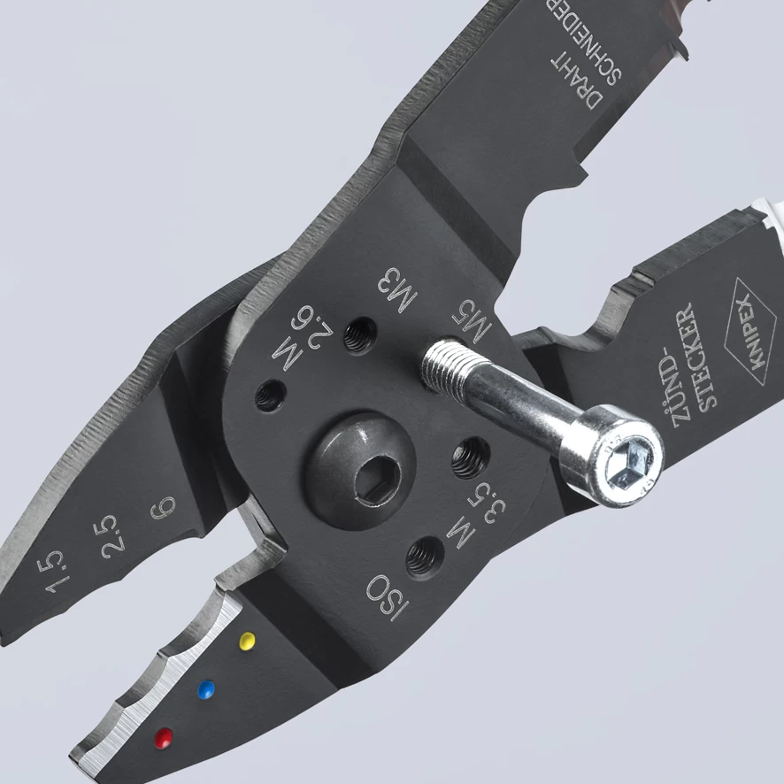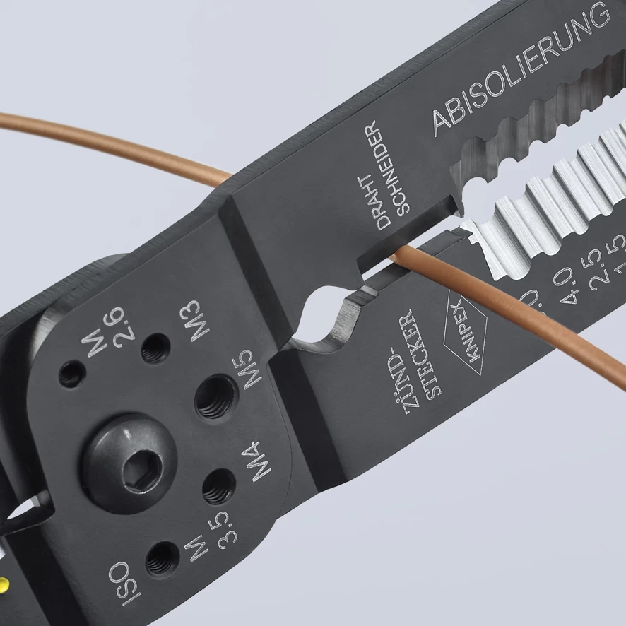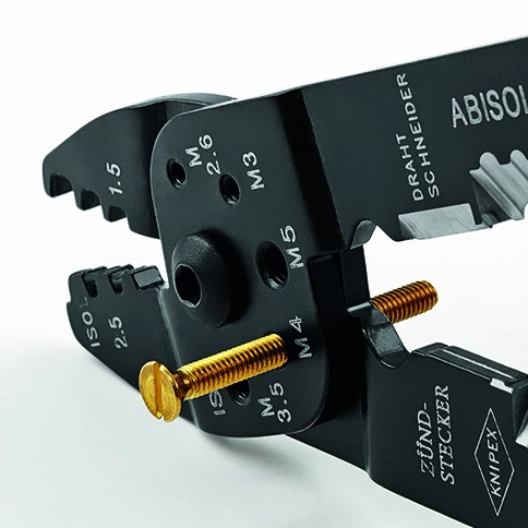 These Knipex 97 21 Crimping Pliers for cutting cables, stripping wires and crimping insulated and non-insulated terminals, connectors and plug type connectors. With threaded holes for cutting copper and brass threaded screws. M2.6 – M3 – M3.5 – M4 – M5. For insulated terminals and cable connectors of 0.5 – 6.0mm².