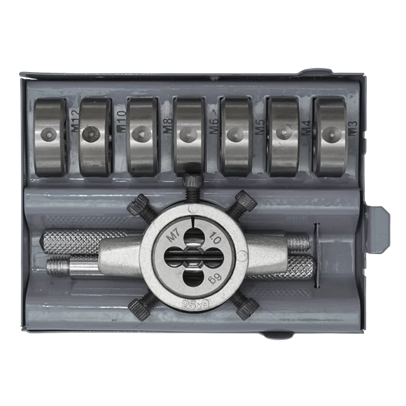 - Contents:Â Dies; 3 x 0.5, 4 x 0.7, 5 x 0.8, 6 x 1, 8 x 1.25, 10 x 1.5, 12 x 1.75mm,