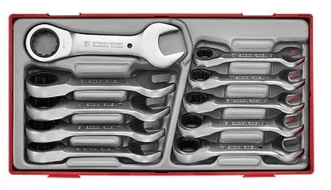 - Set of 10 stubby ratcheting combination spanners made of chrome vanadium steel.