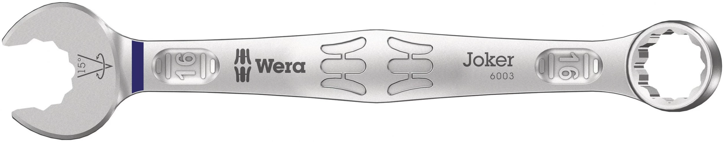 - For very tight spaces – The Joker 6003 ring spanner with its special mouth geometry – a mouth side pivoted by 7.5° and the double hexagon geometry – doubles the placement possibilities when repeatedly turning the wrench 180° around the longitudinal axis. Bolts and screw heads can be “taken“ every 15°. The Joker 6003 will automatically find the respective placement point after every turn.