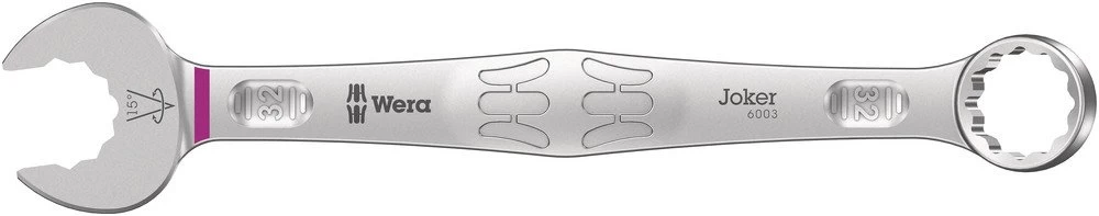 - For very tight spaces – The Joker 6003 ring spanner with its special mouth geometry – a mouth side pivoted by 7.5° and the double hexagon geometry – doubles the placement possibilities when repeatedly turning the wrench 180° around the longitudinal axis. Bolts and screw heads can be “taken“ every 15°. The Joker 6003 will automatically find the respective placement point after every turn.